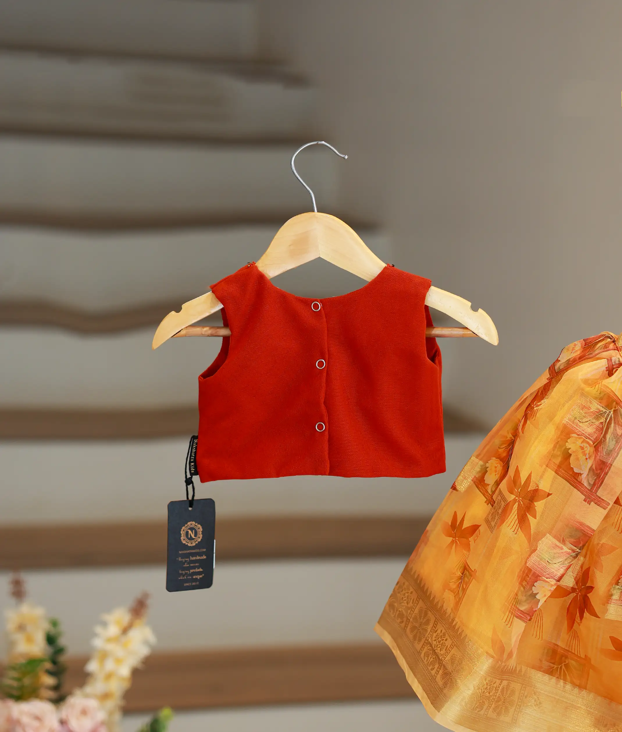 Brick Red Tulle Net Handworked Top With Yellow Printed Organza Skirt For Baby Girl [Ready To Ship: 5227]