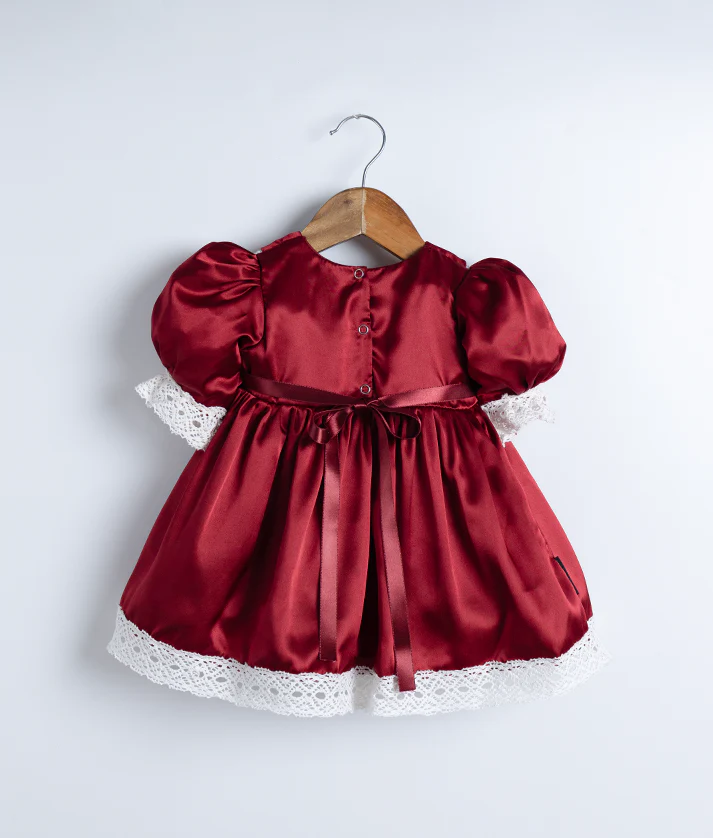 This stunning maroon satin frock is perfect for christmas girls wear collections. This design makes it an ideal choice for festive occasions.