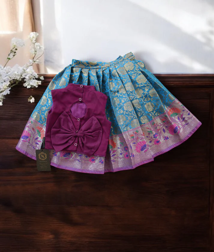 This stunning grape wine crop top and banarasi skirt features high neck collar with handwork and a pleated skirt is perfect for diwali and pongal girls wear collections. The handwork design makes it an ideal choice for festive occasions.