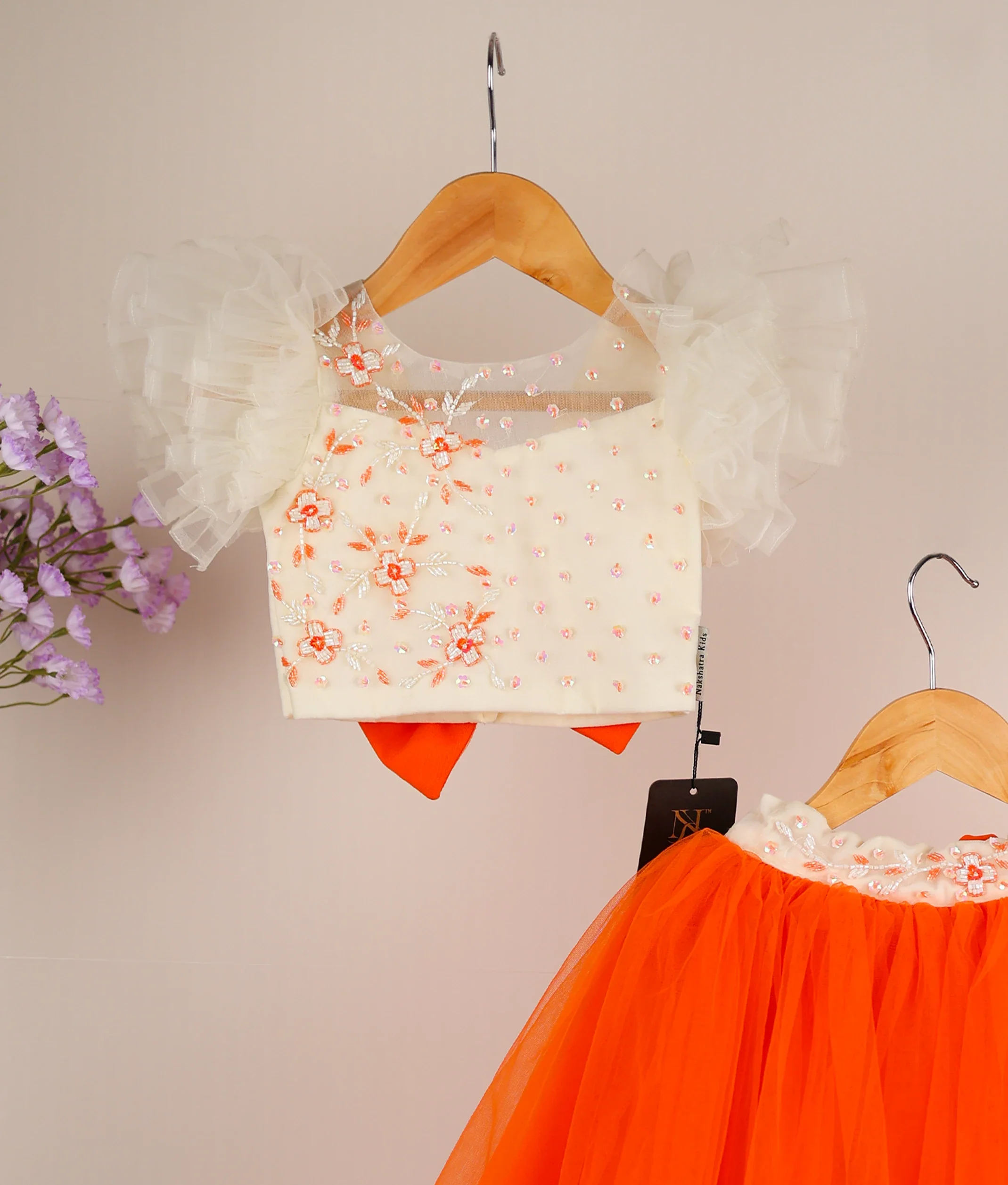 Off-white Tulle Net Handworked Crop Top With Orange Full Length Skirt [Ready To Ship: 5112]