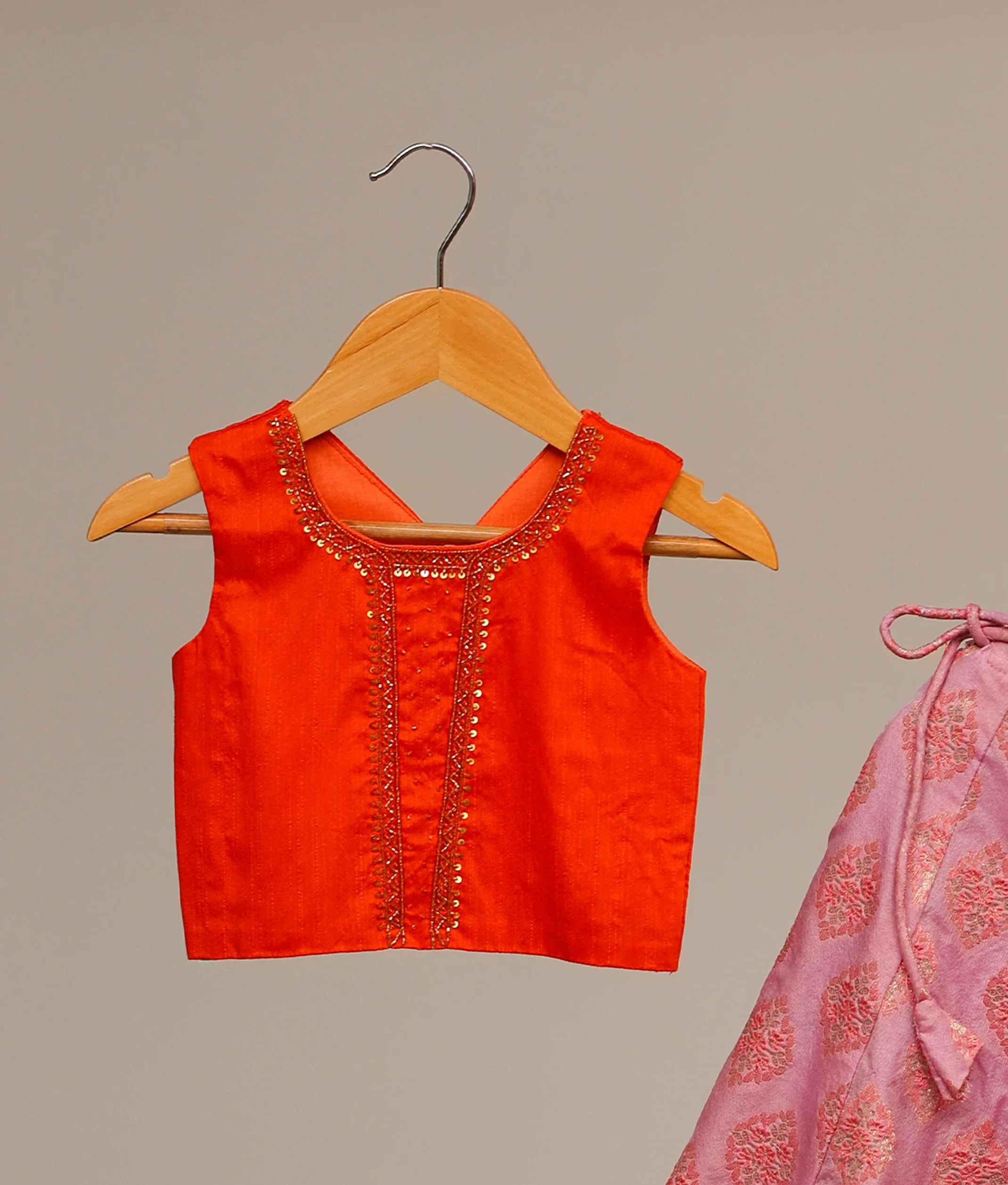 -70%Orange Raw Cotta Handworked Top With Pink Banarasi Skirt For Baby Girl [Ready to ship: 5210]—