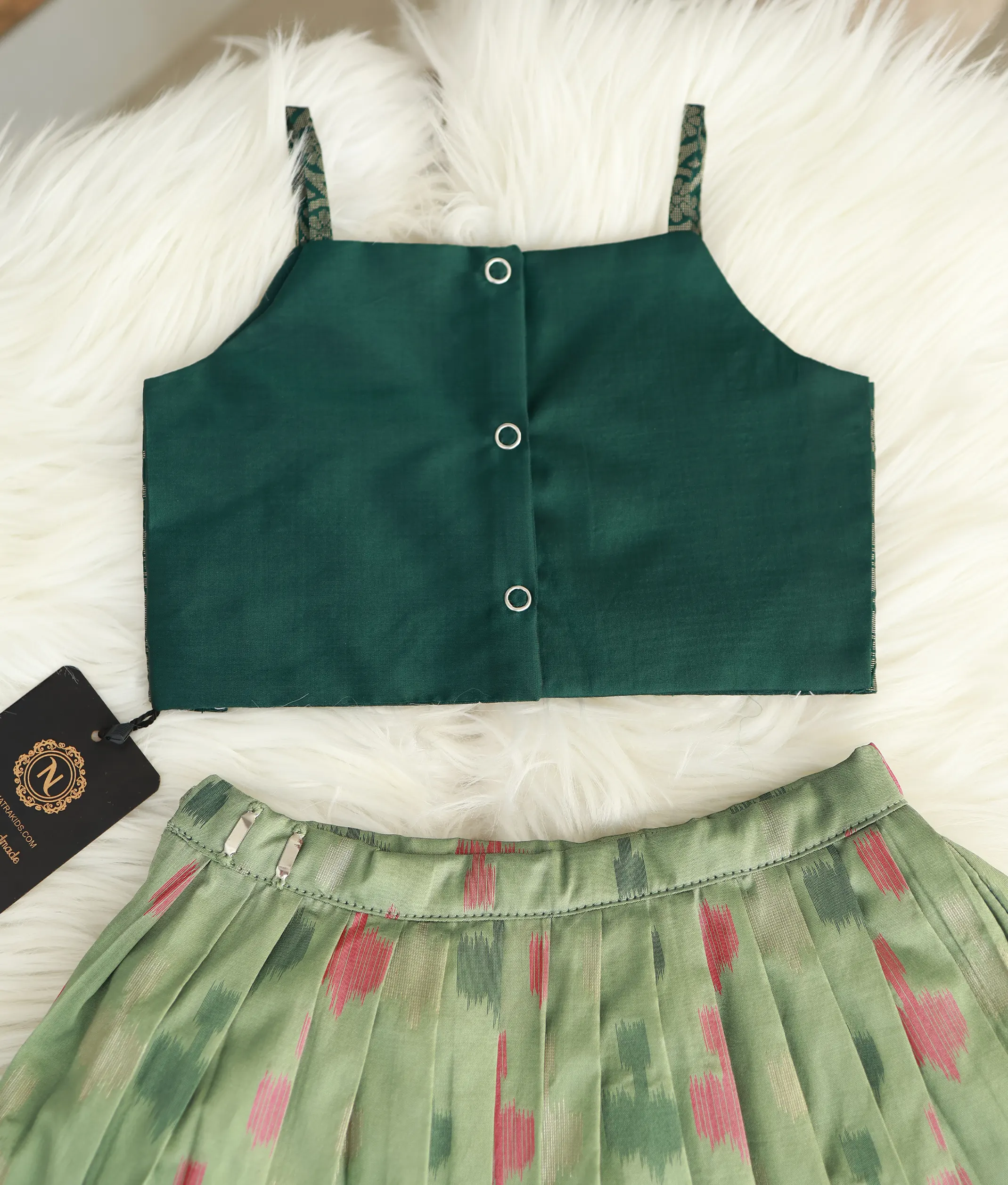 BOTTOM: Pastel green pleated skirt with a mix of pink and golden traditional woven designs