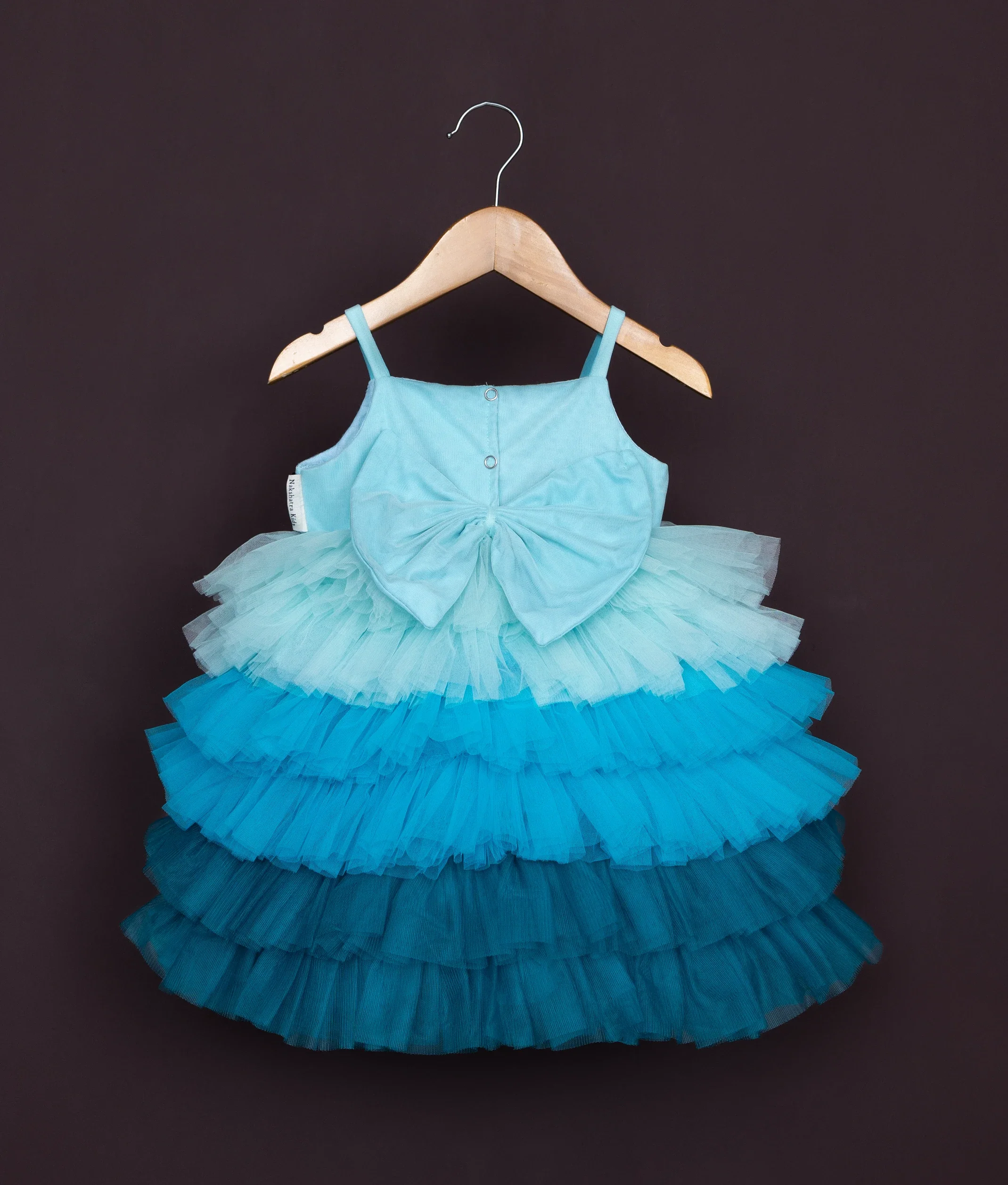 BOTTOM: Voluminous & multiple layers of ruffled tulle beautifully from a light pastel blue at the top to a deeper teal blue at the bottom